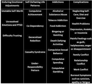 Below is a list of enduring emotional adjustments, self-defeating life patterns, addictions, and complications we’ve covered. Note each pattern and complication that applies to you in your recovery journal.