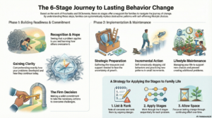 We now understand clearly the process of how to change behavior patterns. Prochaska and DiClemente first described this while studying cigarette smokers trying to quit. Understanding exactly how people change empowers us, and each step we make toward change becomes a waypoint on the journey toward our family goals. The stages of behavior change offer a clear map for parents and children during the process of family growth and adjustment as you replace emotional and behavior patterns that no longer work for you.
