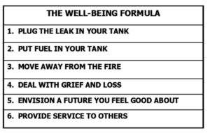 Once we know where a problem is coming from, it becomes clear what to do to overcome it. The Well-Being Formula is a checklist I developed to use in coping with family challenges. If your own or a family member’s instrument panel is lighting up, this provides a quick review to identify where the problem may be coming from.