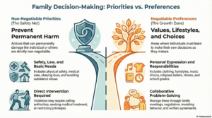 Teenagers are preparing for independence where they’re fully in charge of their actions. The older children are, the more I recommend that parents exercise influence, rather than control, unless it’s an emergency. To give you an idea of family emergencies that require someone to take control, I sort family behavior into non-negotiable priorities and negotiable preferences.