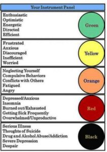 Irritability is a frequent instrument panel warning signal for many of us, so if you feel irritable, ask yourself if you’re tired, lonely, hungry, angry, stressed, or worried? If your instrument panel lights up, use the well-being checklist below to identify what’s bothering you and develop a plan to get back on track. What’s your instrument panel telling you?