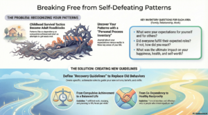 To replace your self-defeating life patterns, you must first recognize how these patterns play out in your life and how they work against your best interests. Then define recovery guidelines for each pattern which applies to you with revised beliefs and learned new skills to meet your needs.